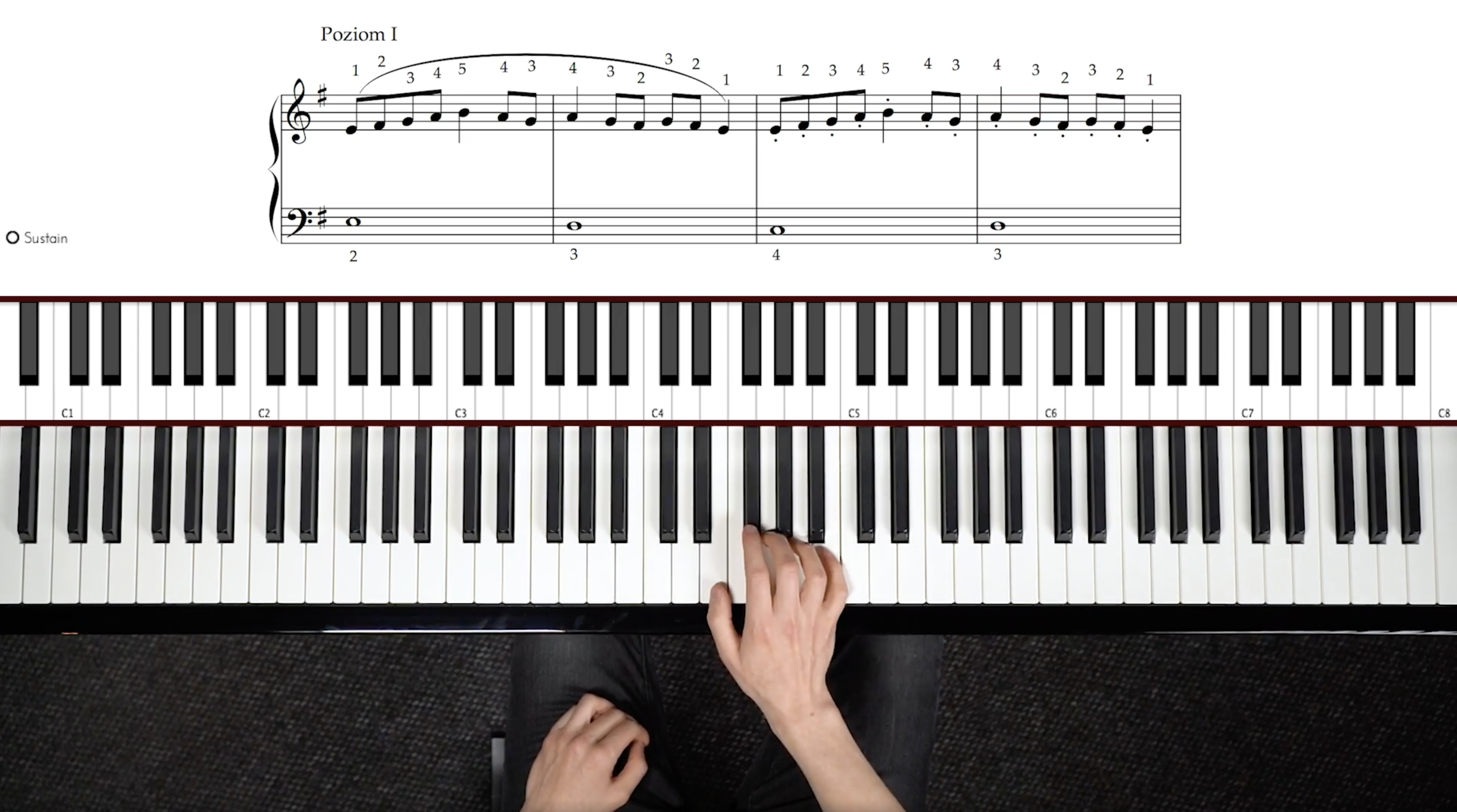 Jedyne czego potrzebujesz to podstawowa umiejętność czytania nut – chociaż… w sumie nawet to nie jest w 100% potrzebne. Bez problemu możesz wykonywać ćwiczenia, naśladując grę instruktora!