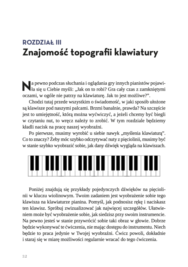 Kolejnym krokiem będzie trening znajomości klawiatury. Od ćwiczeń polegających na wyobrażaniu sobie dźwięków na klawiaturze, po grę z nut, bez spoglądania na klawisze.